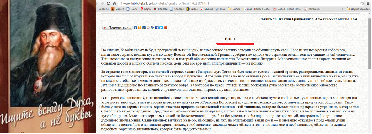 «В рассказе «Роса» святителя Игнатия Брянчанинова речь идет о священноиноке, готовившемся к совершению Божественной литургии, который «…остановился пред лугом обширным … Пред глазами его солнце на лазуревом, чистом небе и бесчисленные отпечатки солнца в бесчисленных каплях росы на лугу обширном…Священноинок взглянул на небо, на солнце, на луг, на блистающие капли росы и внезапно открылось пред очами души объяснение величайшего из таинств христианских...