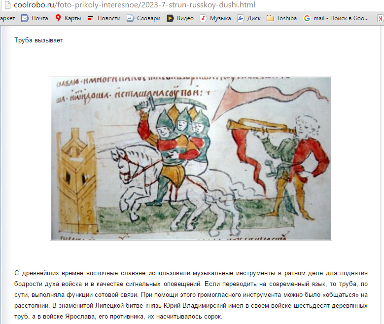 «Русские удачнее сражаются в дальнем бою, чем в ближнем, а потому стараются обойти врага и напасть на него с тыла. У них множество трубачей; если они по отеческому обычаю принимаются все вместе дуть в свои трубы и загудят, то звучит это несколько странно и непривычно. Есть у них и другой род музыкального (инструмента), который на их языке называется szurna, Когда они прибегают к ней, то играют приблизительно с час без всякой передышки или втягивания воздуха… Как говорят, научившись одновременно втягивать воздух носом, издают трубный непрерывный звук….