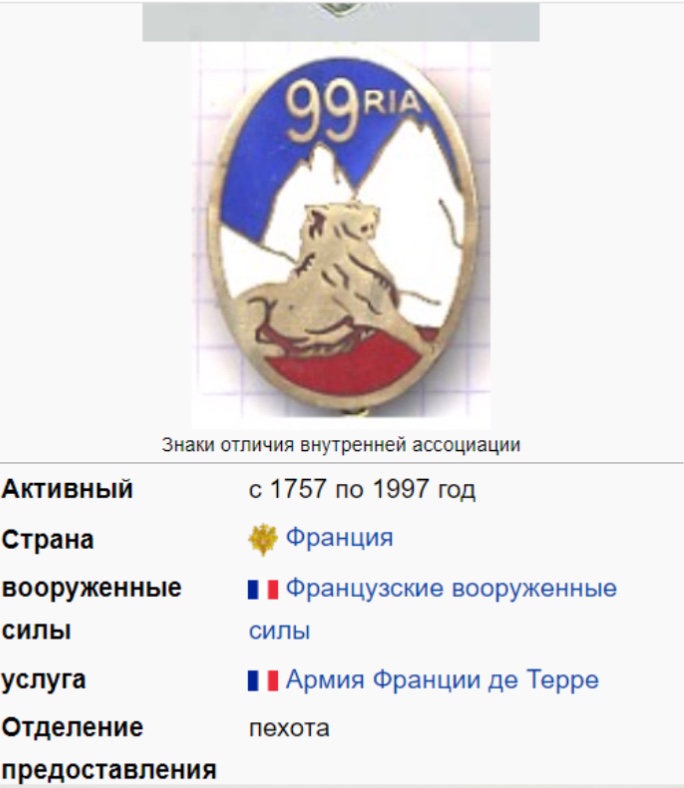 99 - й пехотный полк (иногда также 99- й горно-пехотный полк) — пехотный полк, набранный из иностранцев как Régiment Royal Deux-Ponts ( Royal Regiment Zweibrücken ) на службе у короля Германии. Франция. Это был так называемый иностранный полк (Régiment étrangere) и до 1791 года он состоял преимущественно из немецкоязычных наёмников. Суффикс «Королевский» указывал, что это полк Короны, владельцем полка (полковником), таким образом, был сам король, и им управлял. Основанный в 1757 году, 1 января 1791 года он был переименован в «99 e régiment d'infanterie» (99 e RI).