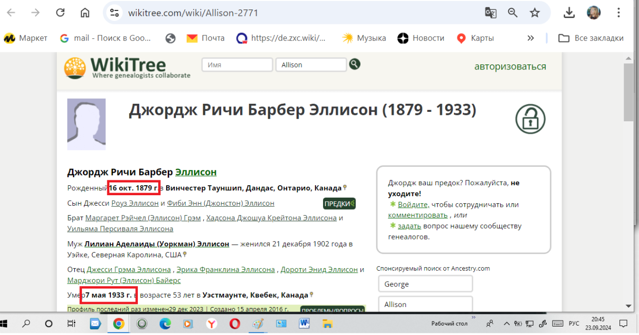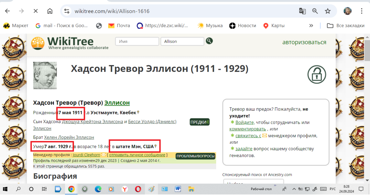 Спасенный ребенок Тревор Эллисон воспитывался у брата погибшего на Титанике Хадсона Эллисона, которого звали Джордж Ричи Барбер Эллисон ( 16 окт. 1879 г.в Винчестер Тауншип, Дандас, Онтарио, Канада — умер 7 мая 1933 г. в возрасте 53 лет в Уэстмаунте, Квебек, Канада. Муж Лилиан Аделаиды (Уоркман). Эллисон — женился 21 декабря 1902 года). Этот дядя спасенного на Титанике младенца Тревора Эллисона, умершего в 1929 году, пережил своего племянника на 4 года. Но умер этот дядя Джордж Ричи Эллисон 7 мая 1933 года в день рождения отравившегося едой в 18 лет Тревора Эллисона, родившегося 7 мая 1911 года, в год основания канадско-британской компании British Lumber Corporation. Похоже речь шла о наследстве. Дата смерти дяди 7 мая 1933 года. И год 33-й. В 1933 году установлены дипломатические отношения США и СССР 16 ноября.