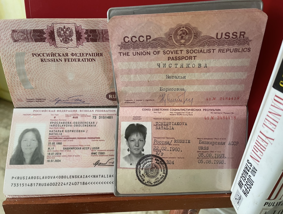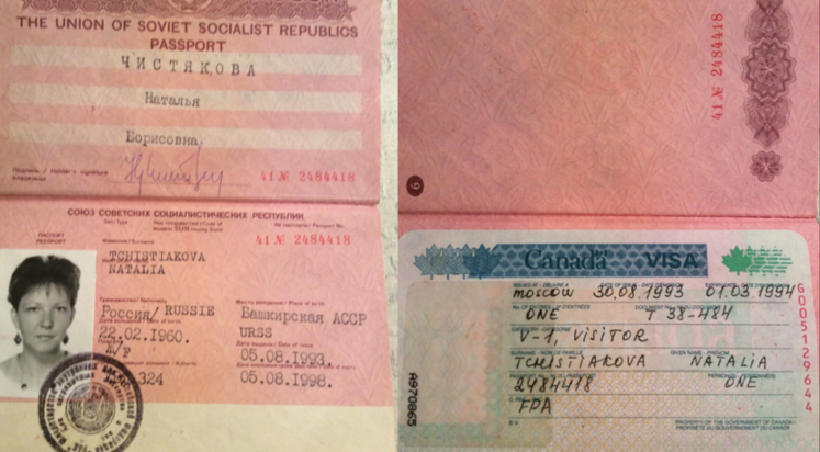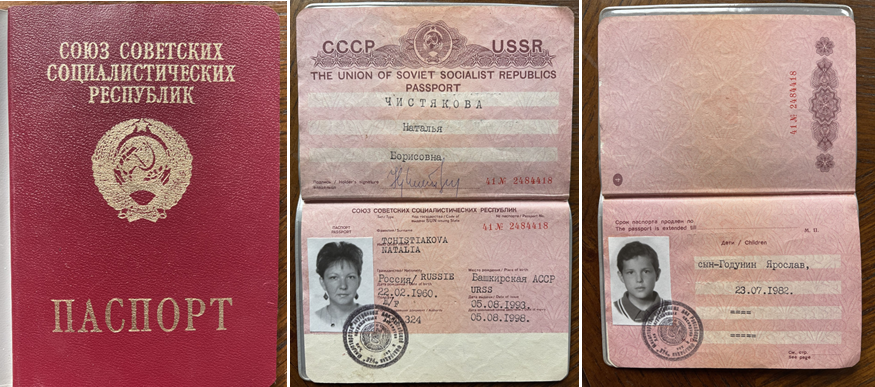 Заграничный паспорт СССР USSR THE UNION OF SOVIET SOCIALIST REPUBLICS. На русском языке мое имя указано Чистякова Наталья Борисовна. На английском языке мое имя указано TCHISTIAKOVA NATALIA