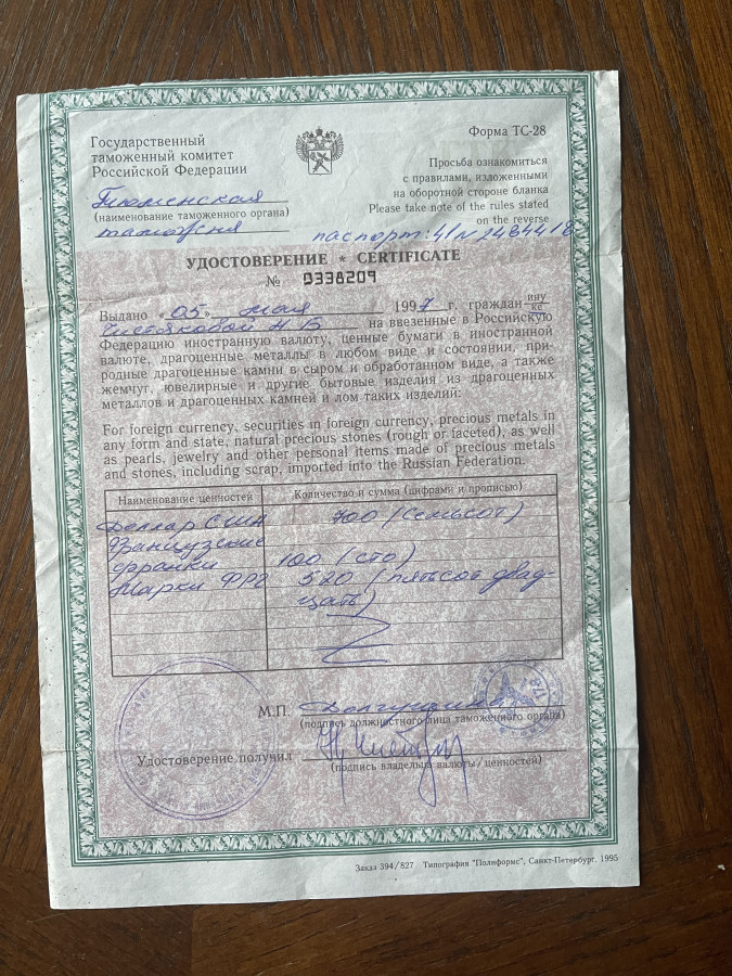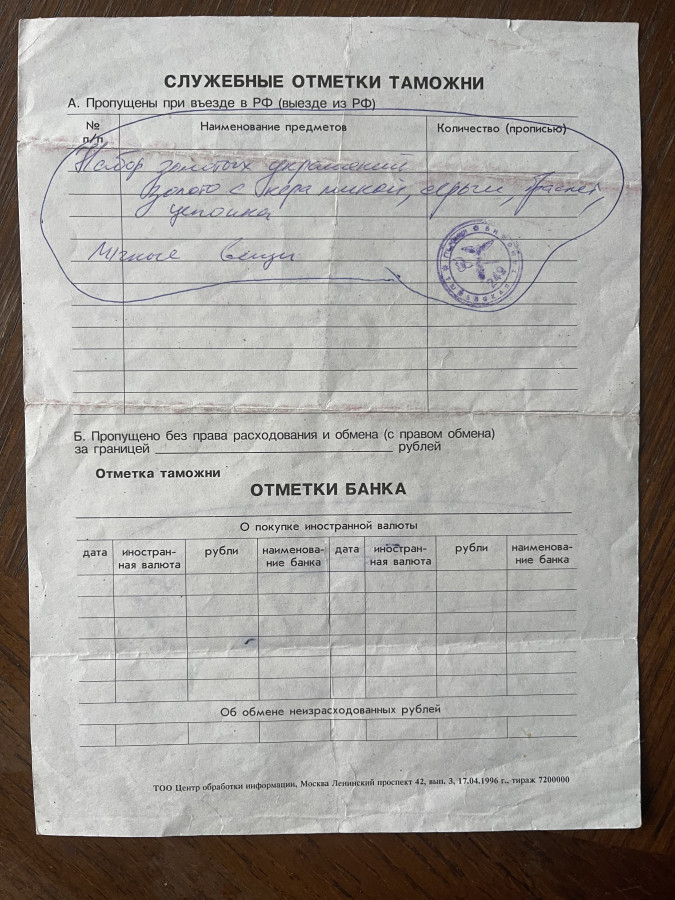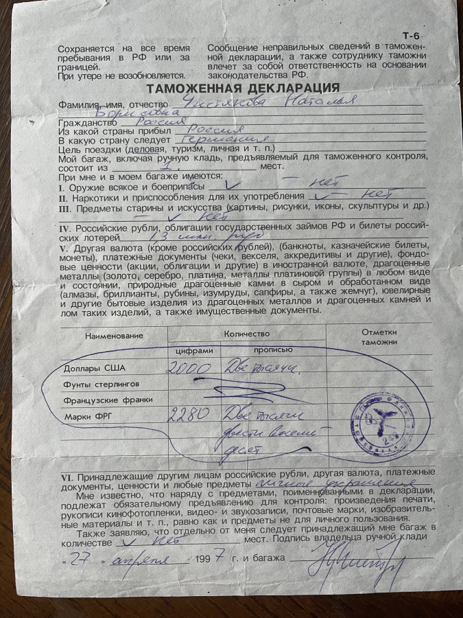 В 1997 году 27 апреля ещё не было евро – единой европейской валюты. Я также перечислила золотые украшения на мне, чтобы при выезде из Германии мои золотые украшения, которые я покупала в других странах до этого, не приняли за то, что я купила в ФРГ.