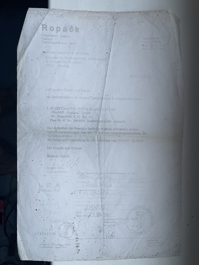 «… Mahlowerstrasse 24 2049 Берлин Консульство Федеративной Республики Германии в Новосибирске Россия ВИЗА Абейлунд. Берлин 20.05.97 Уважаемые дамы и господа Я приглашаю следующего человека в качестве управляющего директора Ropack GmbH ЧИСТЯКОВА НАТАЛЬЯ РОЖДЕНА 22.02.1960. Адрес Россия Тюмень ул. Республики дом 92 кв. 531. Паспорт № 41 № 2484418 Гражданство РФ. Пребывание человека в Берлине срочно необходимо для переговоров по контракту на продажу упаковочных машин, которые мы хотим поставить. Мы просим вас выдать визу для вашего пребывания с 25 мая 1997 г. по 20 июня 1997 г. С наилучшими пожеланиями Ropack GmbH Юрген Отто».