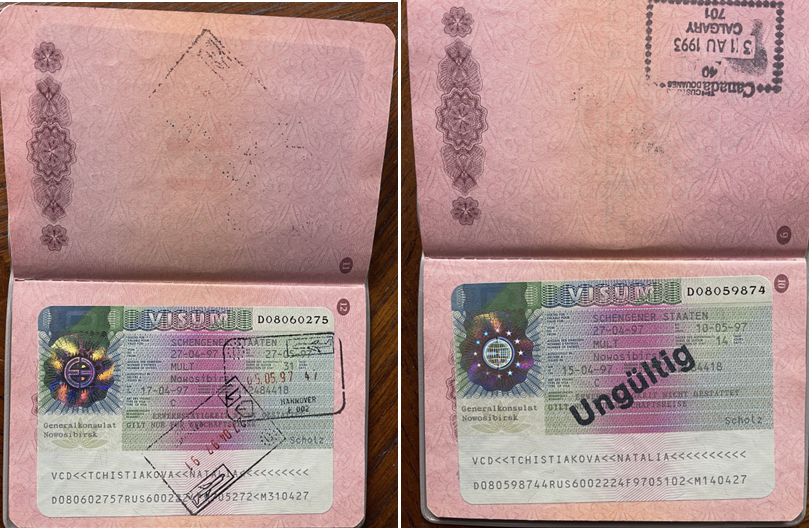 Первая виза от 15 апреля 1997 года на 14 дней была аннулирована, когда оформили вторую визу от 17 апреля 1997 года на 31 день. Это отражено на фотографиях страниц моего заграничного паспорта СССР от 5 августа 1993 года.