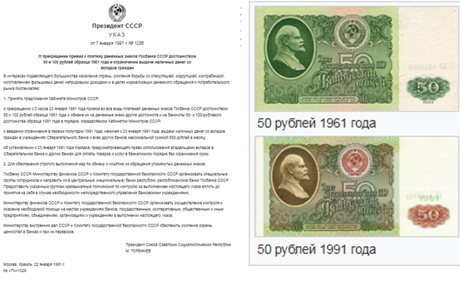 Я урожденная Ярославова Наталья Борисовна, в январе 1991 года в первом браке Годунина Наталья Борисовна, сама попала под эту реформу. Я не знала дату проведения. Тогда в 1990-1991 годах всё, что я урожденная Ярославова Наталья Борисовна (22.2.1960) считала необходимым сделать в денежном обращении СССР, исполнили очень быстро, за пол года. За пол года с 8 августа 1990 года, когда я урожденная Ярославова Наталья Борисовна направила мои обращения в Правительство СССР и сотруднику ООН. Я также, как все меняла, с 23 января 1991 года мои советские деньги на новые купюры по разработанному мною 8 августа 1990 года алгоритму.