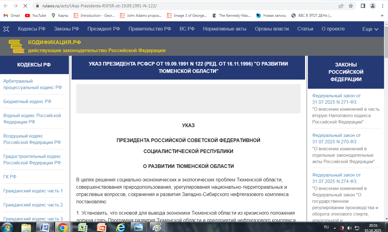 Указ Президента РСФСР от 19.09.1991 г. № 122 «О развитии Тюменской области».