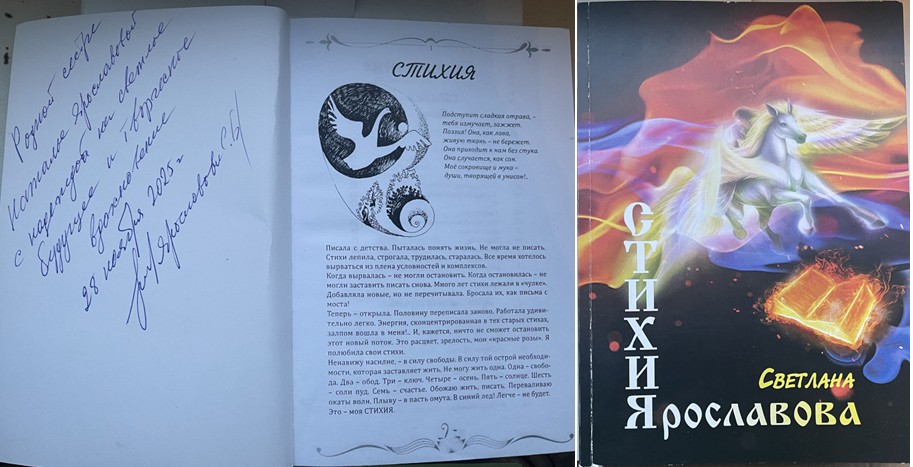 Я написала, что я - в Тюмени. Мы встретились 28 ноября 2025 года, общались около 2 часов. Я упоминала в разговоре, что я была в Рыбинске, работала с архивами Ярославовых, была во многих других городах. Я не писала об этом в Тюмени. Моя старшая родная сестра Ярославова Светлана Борисовна издала ее старые стихи юности, с некоторыми дополнениями после многих лет молчания, когда она не писала. На этом сборнике ее стихов осталась дата 28 ноября 2025 года, когда мы общались впервые после 2014 года. Подпись "Родной сестре Наталье Ярославовой с надеждой на светлое будущее и творческое вдохновение. 28 ноября 2025 года Ярославова С.Б."