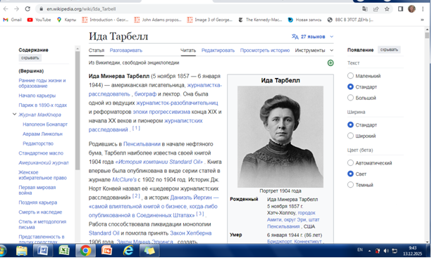 Ида Минерва Тарбелл (5 ноября 1857 — 6 января 1944) — «Она была одной из ведущих журналисток-разоблачительниц и реформаторов эпохи прогрессивизма конца XIX и начала XX веков и пионером журналистских расследований . Родившись в Пенсильвании в начале нефтяного бума, Тарбелл наиболее известна своей книгой 1904 года «История компании Standard Oil» . Книга впервые была опубликована в виде серии статей в журнале McClure's с 1902 по 1904 год. Историк Дж. Норт Конвей назвал её «шедевром журналистских расследований» , а историк Даниэль Йергин — «самой влиятельной книгой о бизнесе, когда-либо опубликованной в Соединенных Штатах» . Работа способствовала ликвидации монополии Standard Oil и помогла принять Закон Хепберна 1906 года, Закон Манна-Элкинса , создать Федеральную торговую комиссию (FTC) и принять Закон Клейтона о борьбе с монополиями 1914 года «