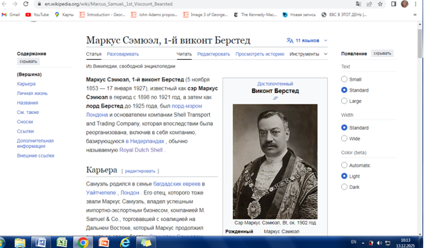 Маркус Сэмюэл, 1-й виконт Берстед (5 ноября 1853 — 17 января 1927), «известный как сэр Маркус Сэмюэл в период с 1898 по 1921 год, а затем как лорд Берстед до 1925 года, был лорд-мэром Лондона и основателем компании Shell Transport and Trading Company, которая впоследствии была реорганизована, включив в себя компанию, базирующуюся в Нидерландах , обычно называемую Royal Dutch Shell . Самуэль родился в семье багдадских евреев в Уайтчепеле , Лондон . Компания M. Samuel & Co. в 1897 году выпустила в Лондоне первый японский золотой заем в фунтах стерлингов и в значительной степени занималась введением муниципальных займов в Японии и развитием угольной торговли в Японии. Он получил образование в Эдмонтоне и Брюсселе , много путешествовал по Азии, прежде чем заняться бизнесом, посетив Цейлон , Стрейтс-Сеттлментс , Сиам , Филиппины , Китай и Японию .
