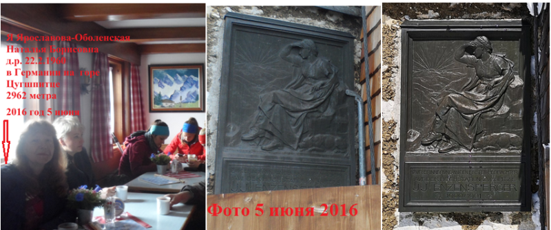 На фотографии 5 июня 2016 года слева (шатенка) я Ярославова-Оболенская Наталья Борисовна, урожденная Ярославова Наталья Борисовна (22.2.1960), в мои 56 лет в Мюнхенском доме на горе Цугшпитце (2962 м.), который начали строить в 1894 году по проекту Адольфа Вэнца к 20-летию Немецко — австрийского альпийского клуба, основанного в 1874 году. Это священное место для альпинистов Австрии и Германии. Это место триумфа их побед при восхождении, отдыха, обогрева, сна, бесед. Это дом. Это Мюнхенский дом альпинистов на вершине Цугшпитце.