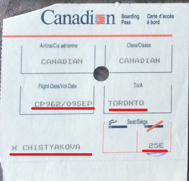 9 сентября 1993 года Canadian Airlines полет из Калгари в Торонто рейс CP62 место 25E я под именем N. CHISTYAKOVA как Чистякова Наталья Борисовна в 1993 году по второму мужу. Сейчас я Ярославова-Оболенская Наталья Борисовна после смены 10 июня 2014 года бывшей фамилии Чистякова бывшего второго мужа на фамилию Ярославова-Оболенская. При рождении 22 февраля 1960 года я Ярославова Наталья Борисовна