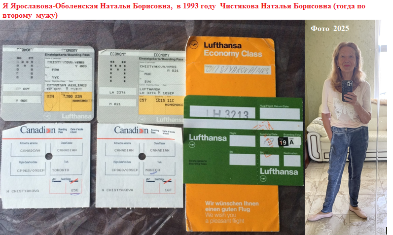9 сентября 1993 года Canadian Airlines полет из Торонто в Мюнхен рейс CP60 место 16F я под именем N. CHISTYAKOVA как Чистякова Наталья Борисовна в 1993 году по второму мужу. Сейчас я Ярославова-Оболенская Наталья Борисовна после смены 10 июня 2014 года бывшей фамилии Чистякова бывшего второго мужа на фамилию Ярославова-Оболенская. При рождении 22 февраля 1960 года я Ярославова Наталья Борисовна