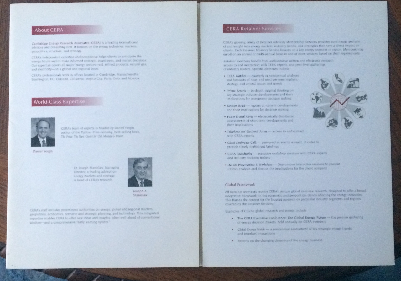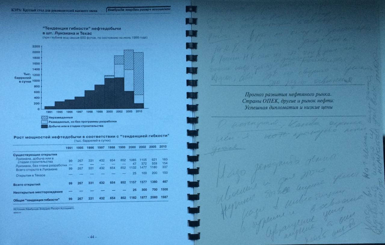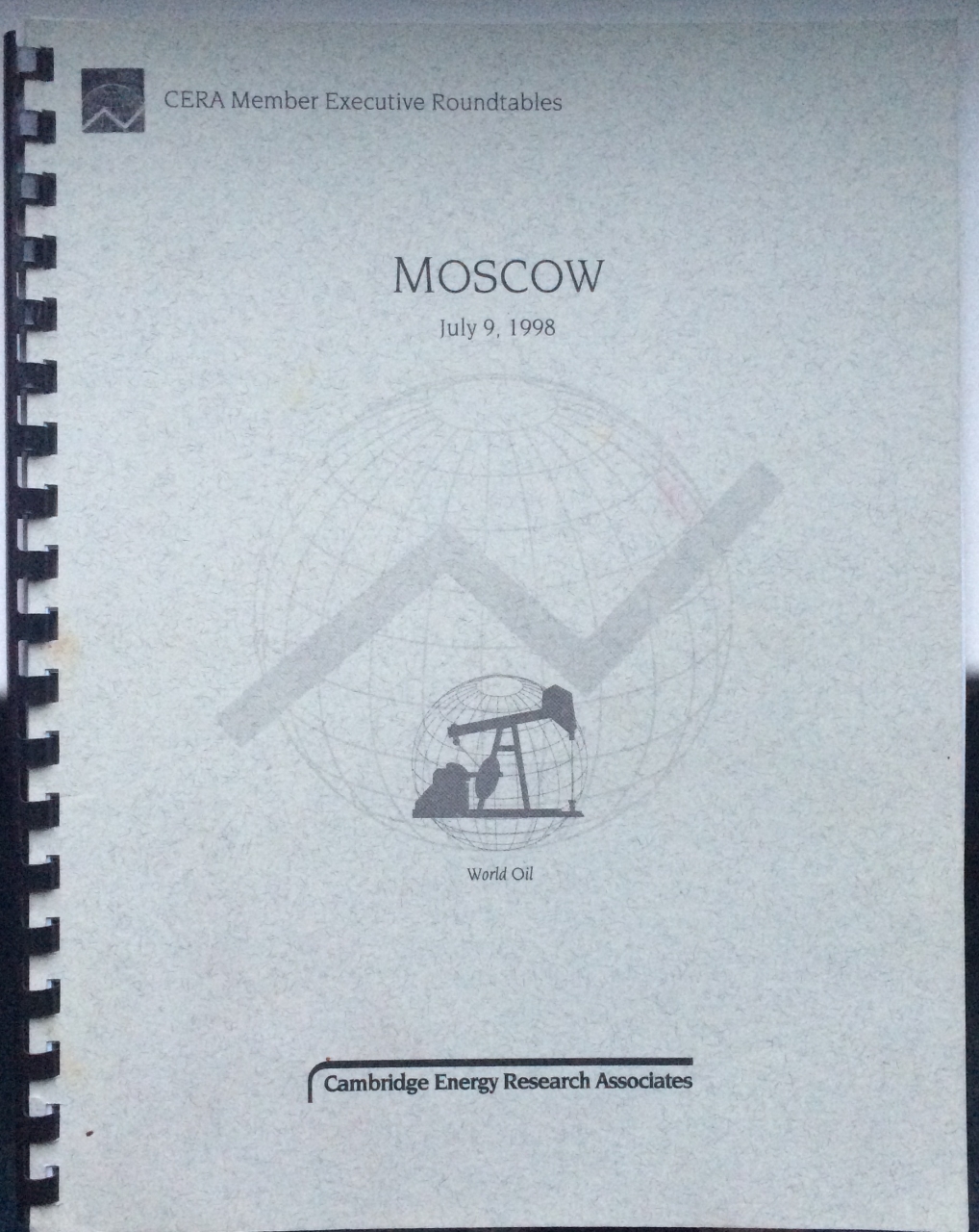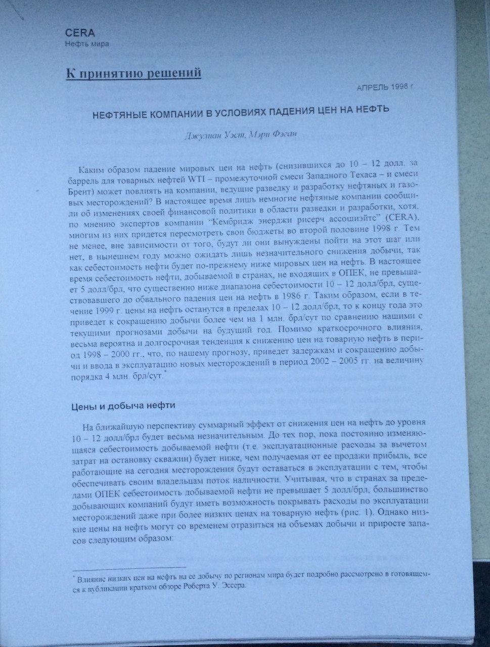 У меня оказалось два аналитических материала объемом 77 страниц Круглого стола CERA для руководителей высшего уровня в Москве 9 июля 1998 года «Мировая Нефть» Кэмбридж энерджи рисерч ассошиэтс (КЭРА на русском языке).