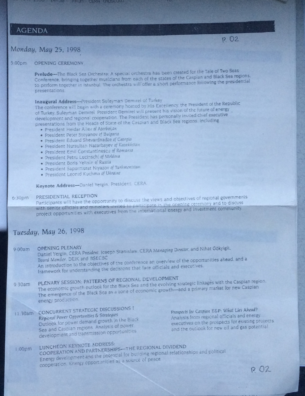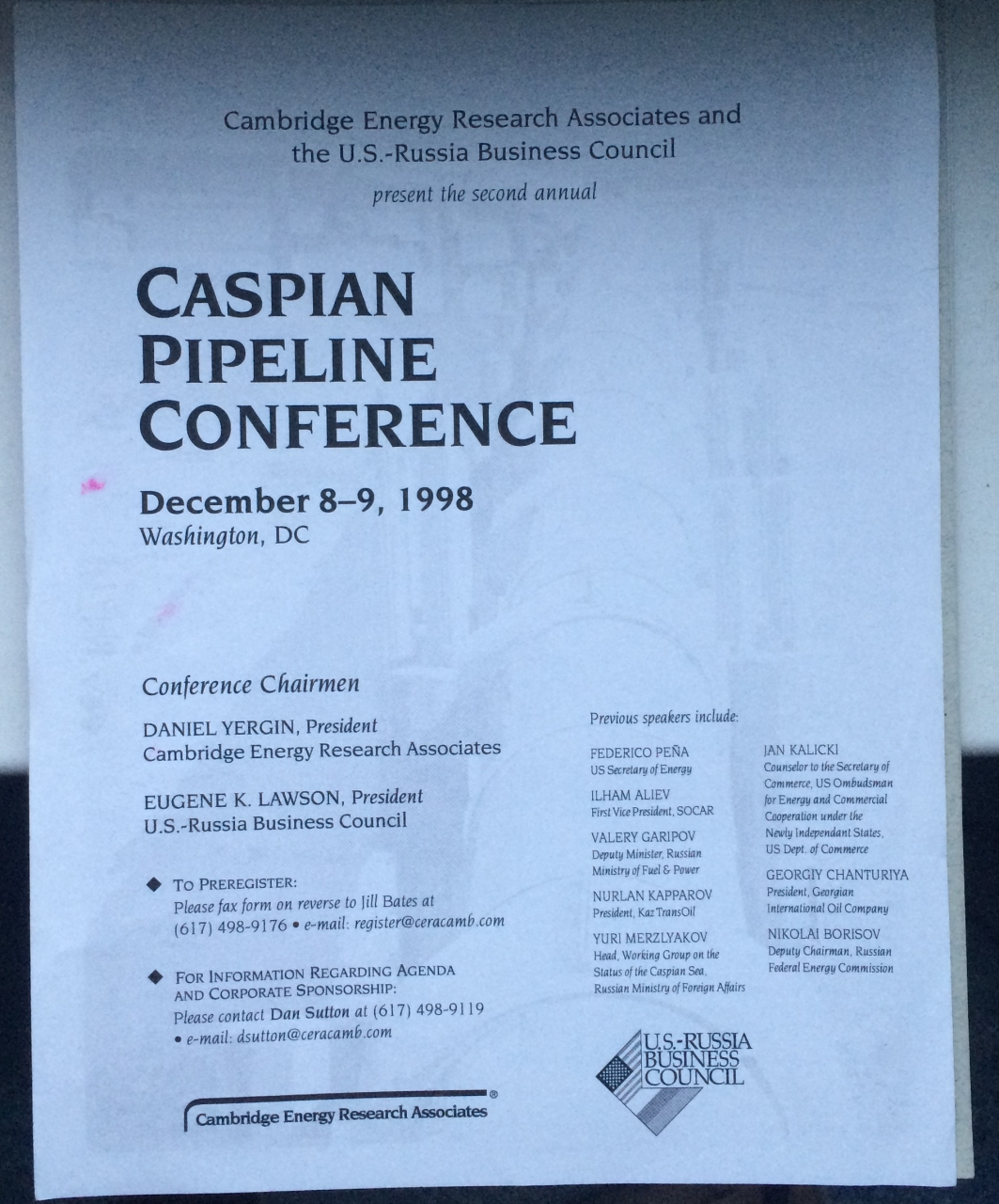 Круглый стол CERA 9 июля 1998 года был посвящен, в том числе, теме Каспийского бассейна: «Новая динамика нефтяных рынков: значение для России и стран Каспийского бассейна».
