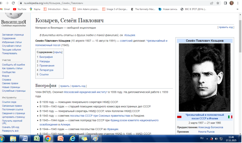 Два Козыревых: министр иностранных дел А.Козырев. и С.П.Козырев (15 апреля 1907 — 15 августа 1991) — в 1966—1983 годах — заместитель министра иностранных дел СССР, участник Потсдамской конференции (1945)— отец жены Иванова И. министра иностранных дел с 11.9.1998.
