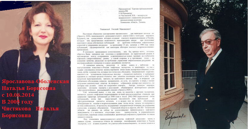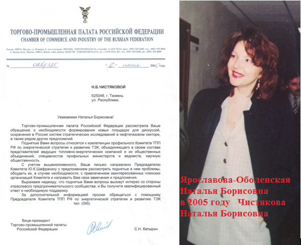 Я Ярославова-Оболенская Наталья Борисовна, в 2003 году Чистякова Наталья Борисовна по фамилии бывшего второго мужа, была на этих Международных форумах и 10-летии ТПП Ханты-Мансийского округа, куда впервые прилетал по состоянию на 2003 год президент ТПП РФ Е.М.Примаков экс глава МИД, экс премьер-министр, с которым мой теперь бывший второй муж Чистяков Александр Ильич (1.5.1949) в 1991 году в феврале летал в регион «Бури в пустыне».