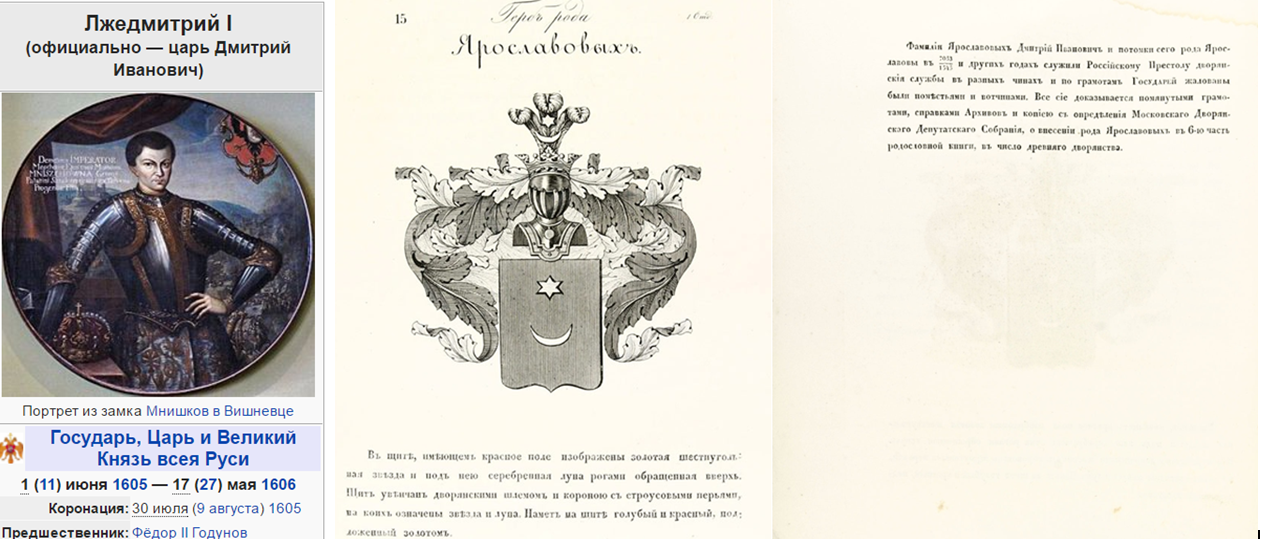Уже после того, как царя Дмитрия Ивановича (Лжедмитрия) стали пытаться отождествлять с Дмитрием Ивановичем Ярославовым из Бархатной книги, я обратила внимание на то, что по датам они не могут быть одним и тем же лицом. Лжедмитрий родился в конце 16 века. А боярин Дмитрий Иванович Ярославов упоминается по разным источникам то в 1545 году, то в 1575 году