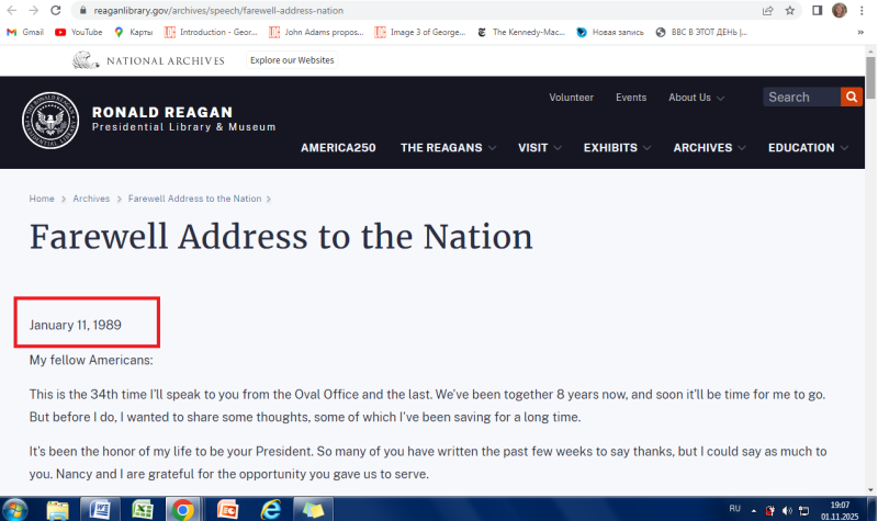 11.1.89 Прощальная речь президента Р.Рейгана. 11.1.89 утверждение в ВАК — Высшей аттестационной комиссии моей Ярославовой-Оболенской Н.Б., в 1989 Годуниной Н.Б., диссертации, с датой защиты 26.5.88. Р.Рейган в СССР 29.5.88. Речи Рейгана и моя диссертация