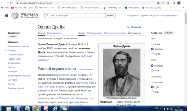 Первый герой книги Д.Ергина - Эдвин Лорентин Дрейк (29 марта 1819 — 9 ноября 1880), «масон, также известный как полковник Дрейк, был американским бизнесменом и первым американцем, успешно пробурившим нефтяную скважину на острове на Ойл-Крик». Дрейк был изобретателем и его должность кондуктора тоже сыграла роль в его судьбе. Я Ярославова-Оболенская Наталья Борисовна уделяю внимание Дрейку потому, что он был первым в США и потому, что первая моя урожденной Ярославовой Натальи Борисовны реальная должность в моей жизни, где я трудилась, - это была должность инженера НИСа на кафедре Бурения Нефтегазового факультета Тюменского индустриального института с 1 марта 1984 года. Я понимаю значение изобретения буровой трубы, что сделал именно Дрейк. Дрейк сцеплял трубы, как, по сути, вагоны. Длина трубы в буровой скважине может наращиваться также, как длина состава поезда. Это он применил.