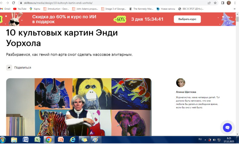 «Одно из первых произведений Энди Уорхола, которое принесло ему международное признание. По сути, это не одна картина, а целая серия из 32 холстов, на каждом из которых — разный суп. Почему именно суп? Существует легенда, что Энди Уорхол выбрал Campbell’s как символ всенародно узнаваемого американского бренда — а именно брендирование было ключевым элементом его творчества».Он исследовал тему брендов и в других работах: «Зелёные бутылки Coca-Cola» (1962), «Коробки Brillo» (1964), а позже — в коллаборациях с Жан-Мишелем Баскиа. В них Уорхол переработал логотипы американских корпораций Arm & Hammer и General Electric"
