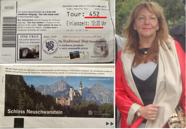 • 10:50 баварское время - время покупки 4 июня 2016 года на моихЯрославовой-Оболенской Натальи Борисовны билетах в замок НойшванштайН в 12:20 очередь 452