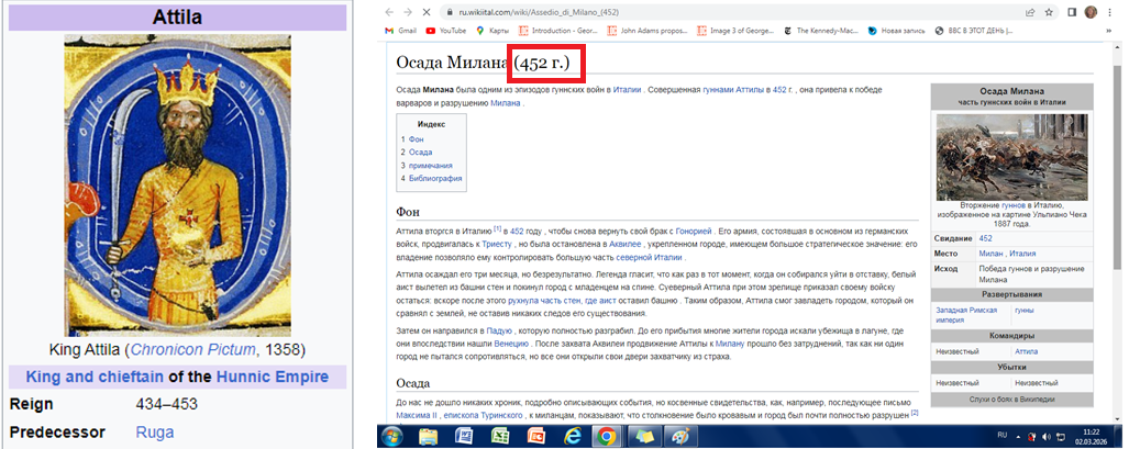 452 год - год вторжения Атиллы в Италию, когда Атилла и гунны разорили Аквилеи, Медиолан (Милан), Патавиум (Падуя), Верону, Бриксии (Брешия), Бергамо и другие города. Император Западной Римской империи Валентиниан III (425-455) купил мир ценою огромного выкупа. В этом же 452 году была основана Венеция и королевство свевов.