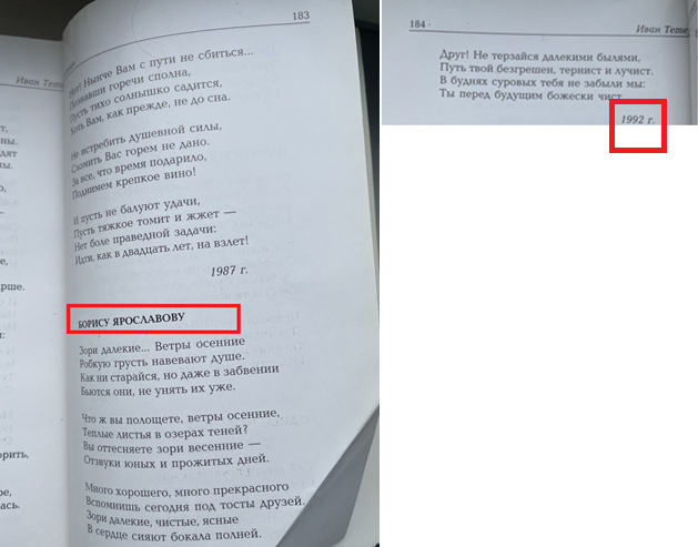 Моему Ярославовой-Оболенской Н.Б., урожденной Ярославовой Н.Б., деду Ярославову Р.В., моему отцу Ярославову Б.Р. и Ярославову В.П. посвящал стихи Тетерев И.Г. в сборнике его стихотворений, подписанном мне 15.8.1997